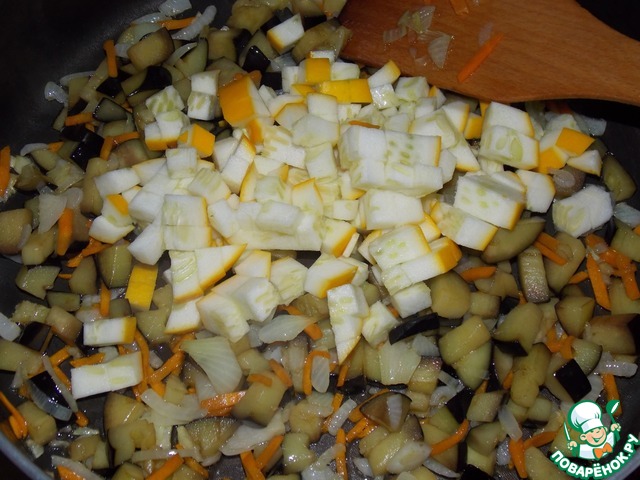 Обжарить лук, морковь и баклажаны в течении 10 минут. -
