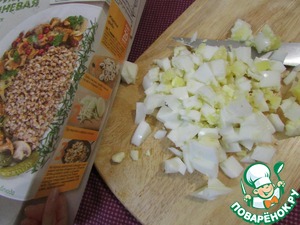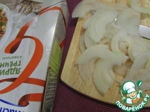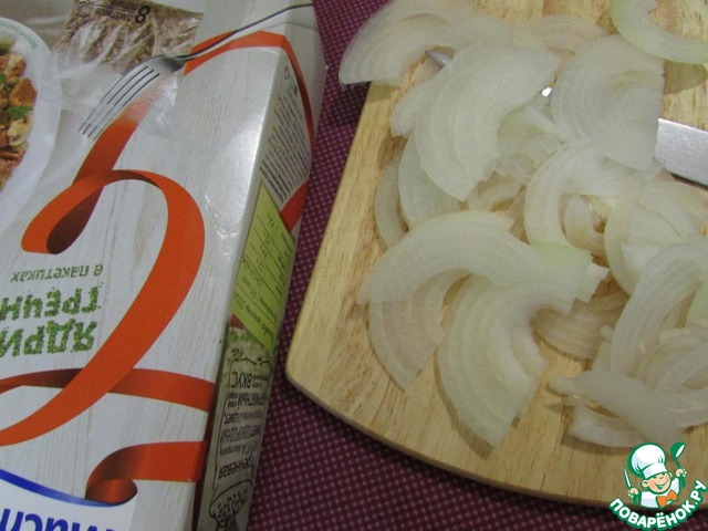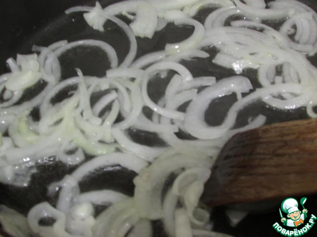 Приготовить начинку. Репчатый лук почистить и нарезать полукольцами.