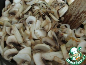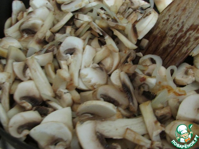 К луку добавить грибы. Посолить, поперчить и обжаривать до готовности.