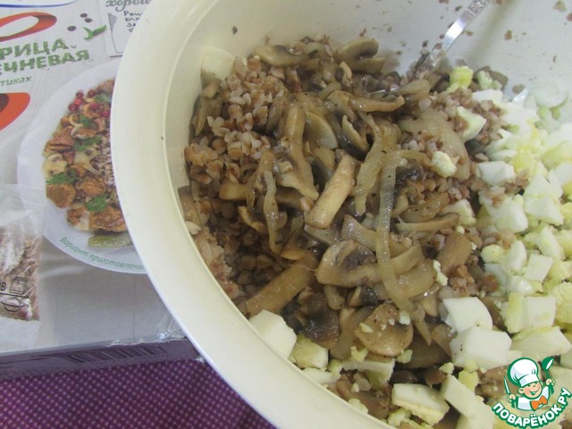 В миске смешать гречку, грибы и яйца. Начинка получается очень вкусной и может рассматриваться, как самостоятельное блюдо (гарнир), или как начинка в пироги.