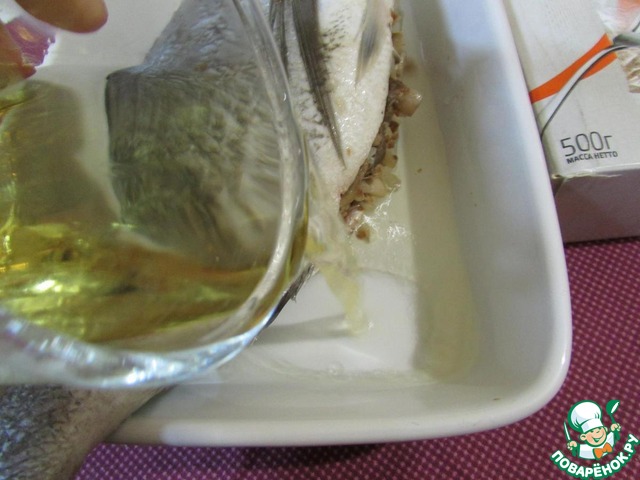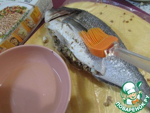 Рыбу посолить, поперчить внутри и снаружи и наполнить гречневым фаршем.