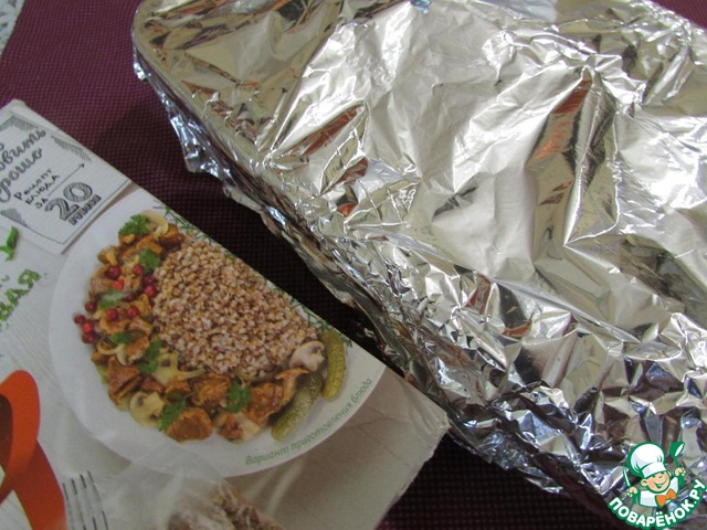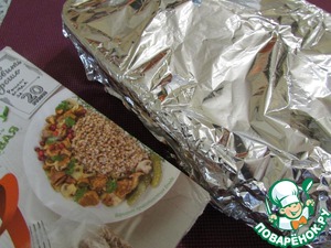 Закрыть форму фольгой, подвернув края. Поставить в разогретую духовку (200 градусов), примерно на 20-25 минут. Затем фольгу снять и дать рыбе зарумяниться (у меня ушло ещё 15 минут). Рыбу извлечь из духовки.
