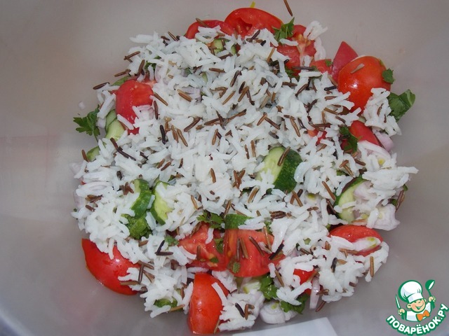 Всё соединить, добавить 3ст. л. отварного риса, посолить и поперчить.