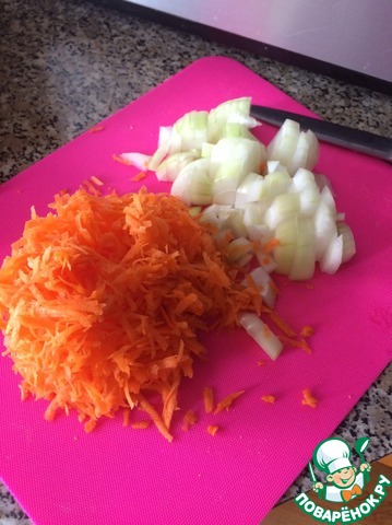 Лук порезать кубиком, морковь натереть на крупной тёрке.