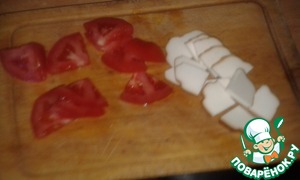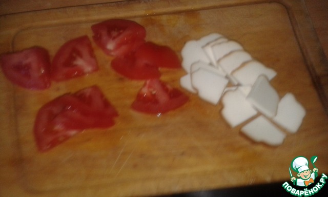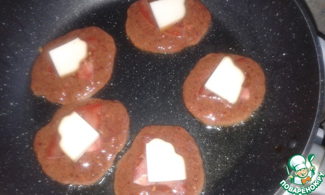 На нагретую сковороду с растительным маслом столовой ложкой выкладывать оладушки, сверху положить по ломтику сыра и помидора