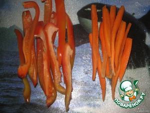 • Нарезать перец и морковь вдоль соломкой.