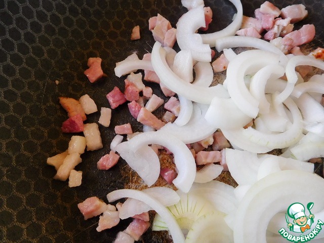 Немного позже добавить лук, нарезанный полукольцами. Обжарить до прозрачности лука. -