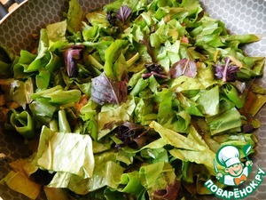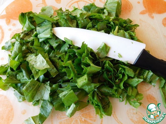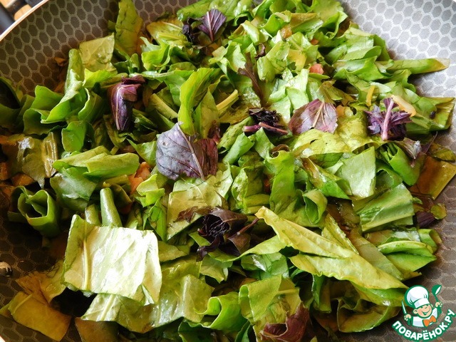 Как только лук дойдет до готовности, отправить на сковороду щавель и базилик.
