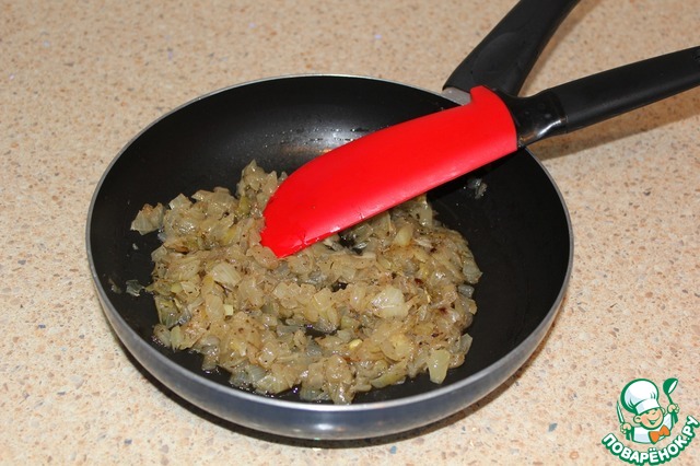 Репчатый лук мелко порезать. На сковороду добавить растительное масло. Пассеровать лук до мягкости, затем добавить пряную сушеную зелень.