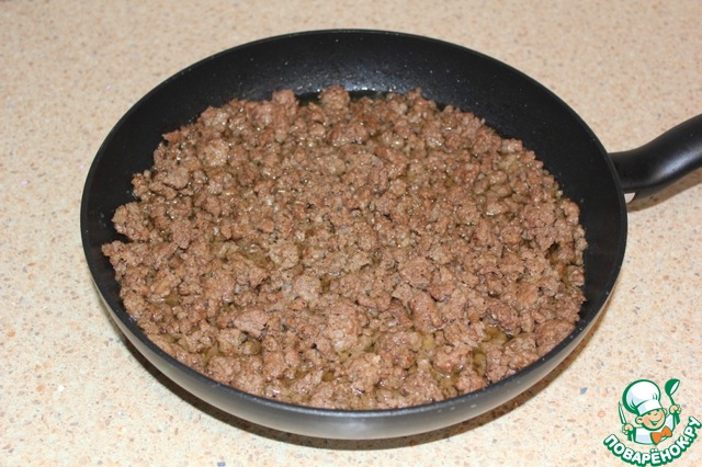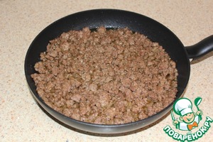 Добавить к пассерованному луку фарш. Смесь обжарить.