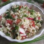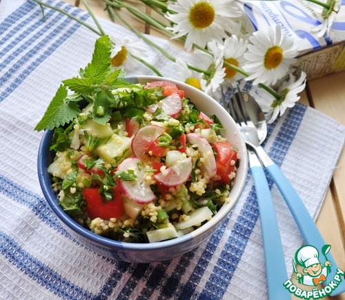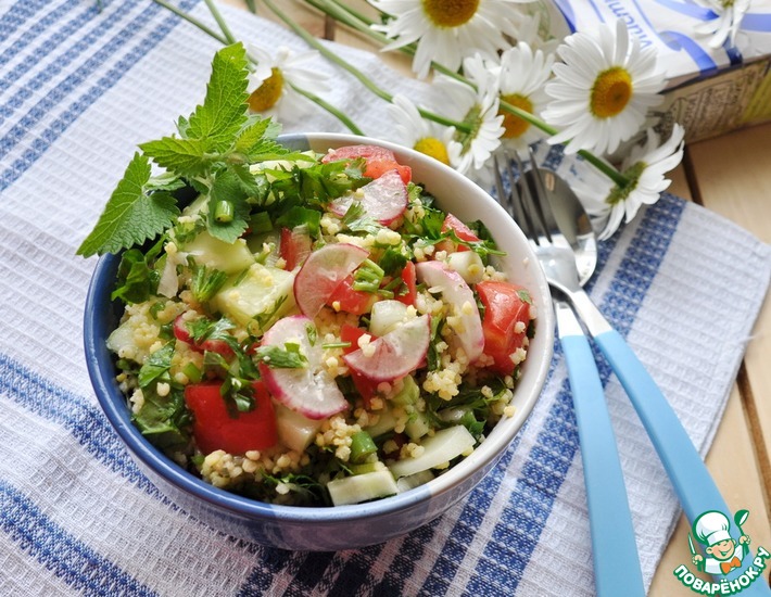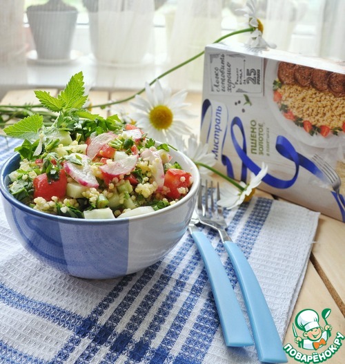 Табуле – традиционное блюдо арабской кухни. Табуле можно считать как салатом, так и основным блюдом, что очень востребовано на даче. Главный ингредиент табуле – крупа булгур или кус-кус. Овощная часть – всё, что нашлось в огороде: помидоры, огурцы, лук, перец, зелень. Заправка состоит из оливкового масла и лимонного сока. Табуле – лучший пример сбалансированного блюда. В нём множество витаминов, минералов, клетчатки. Предлагаю вам рецепт этого салата в русском стиле с пшеном. А крупы в пакетиках от "Мистраль" намного облегчат приготовление этого блюда.