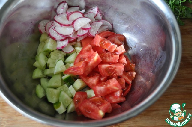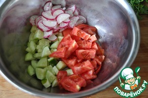 Овощи моем. Огурец и помидор режем кубиками, редис тонкими полукольцами.