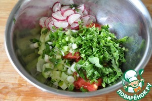 Кинзу, мяту, зелёный лук моем, мелко рубим. Используем только листья мяты, а с зелёного лука как зелёную, так и белую часть.