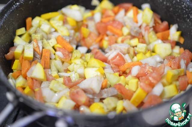 После чего в сковороду отправить все овощи и на большом огне обжарить. Посолить и поперечить по вкусу.