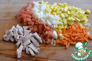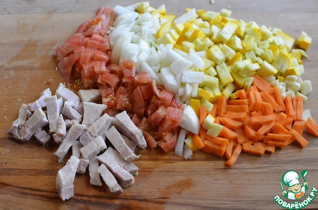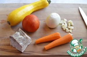 Лук, чеснок, помидор и кабачок порезать кубиками.