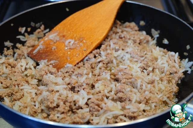 Как только фарш будет готов, добавить отварной рис. Смесь прогреть на сковороде.