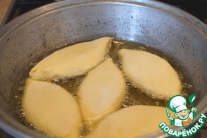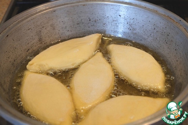 Добавить на сковороду растительное масло, примерно 1-1,2 см (пирожки мы будем жарить во фритюре), поэтому количество масла должно быть достаточным.