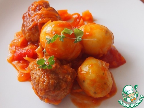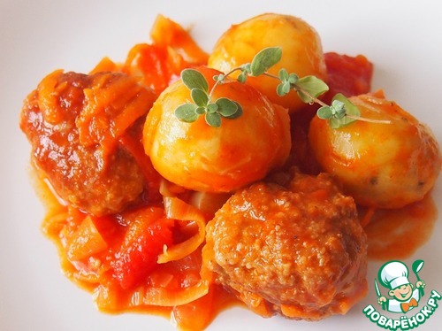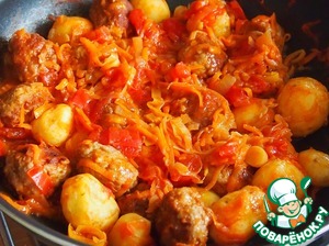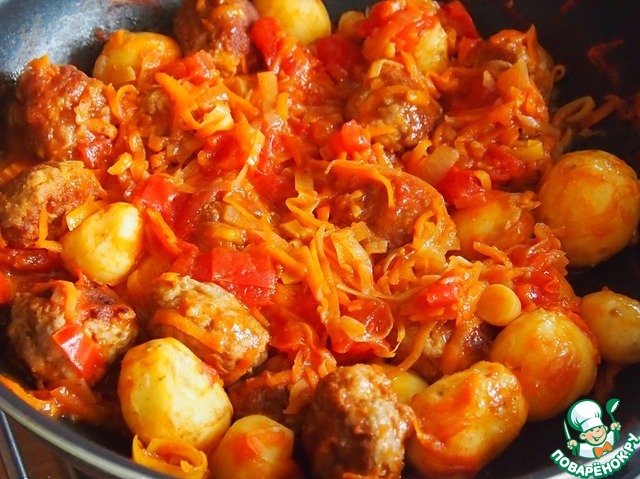 Лук порезать, морковь натереть на крупной терке, обжарить на сковороде, добавить порезанные кусочками помидоры, томатный соус и потушить несколько минут. Добавить фрикадельки и картошку. Все перемешать и тушить до готовности. При необходимости добавить немного воды.