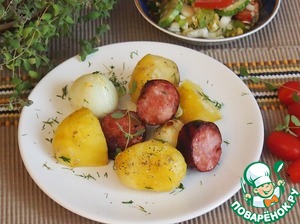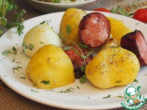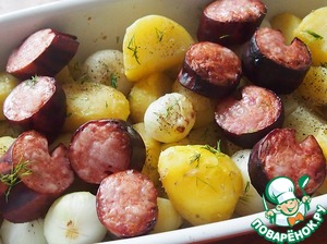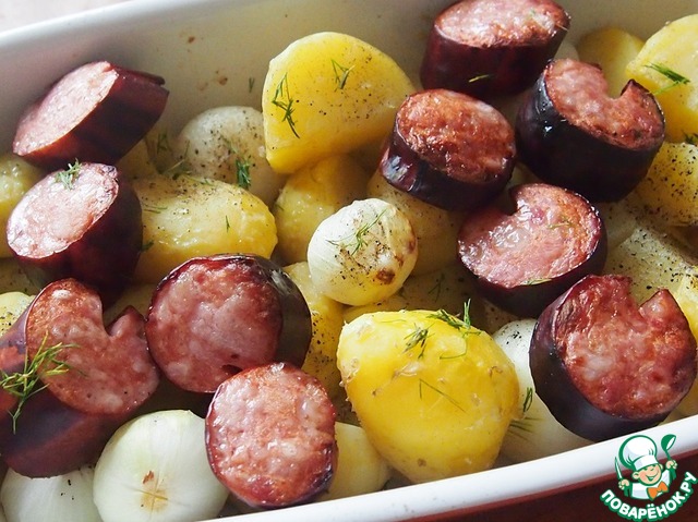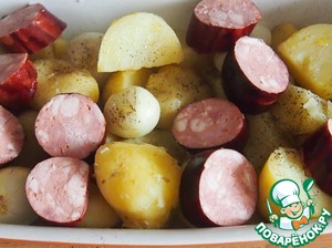 Полукапченую колбасу (или по вашему усмотрению) порезать на куски примерно 3 см и разложить сверху на картофель.