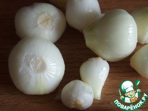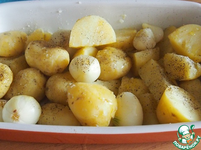 Второй рецепт еще проще. Картошку (к сожалению, мелкая картошка у меня закончилась, пришлось крупную разрезать на несколько частей) и лук почистить. На "попке" луковиц сделать крестообразный надрез, это нужно для того, чтобы луковки остались целыми и не развалились.
