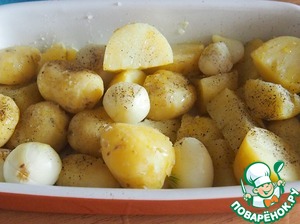 Картошку и лук залить кипятком и варить до готовности, лук вынуть немного раньше, как только станет мягким. Готовый картофель и лук сложить в блюдо для запекания, полить оливковым маслом, посолить, поперчить, посыпать сушеным майораном.