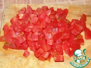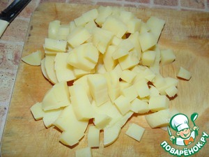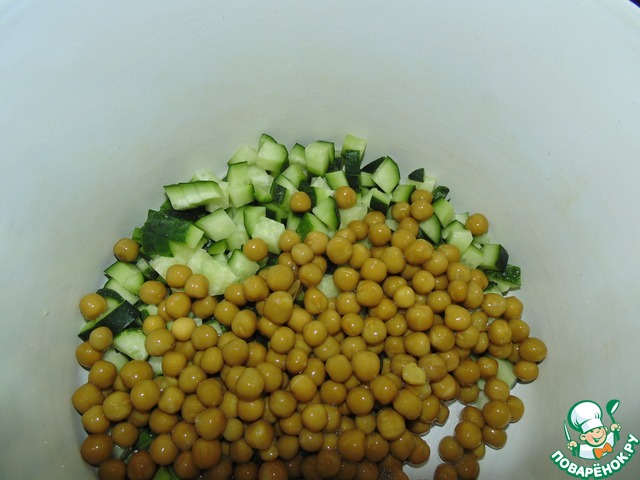 Огурец порезать кубиком. Всыпать зеленый горошек.
