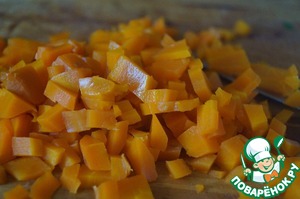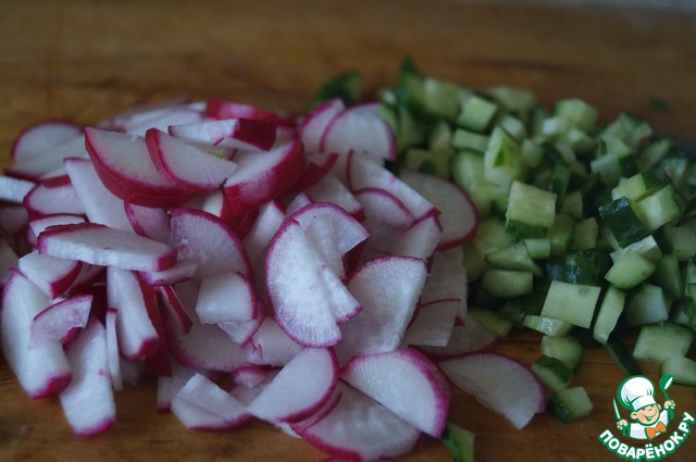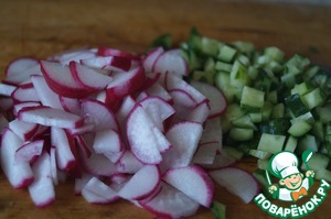 Режем мелкими кубиками огурцы и - тонкими полукружьями редис.