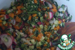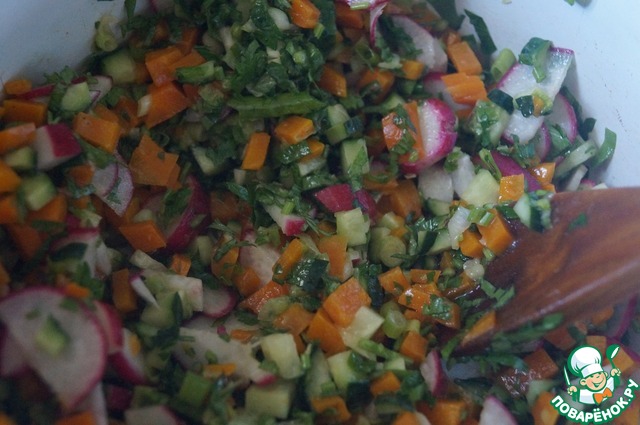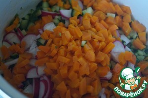 Огурцы, редис и морковь добавляем в кастрюльку.
