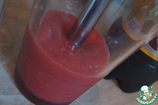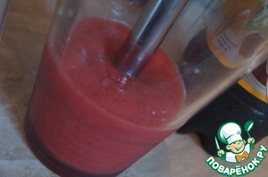 В замороженную клубнику добавляем полстакана воды, сахар (мёд) и пюрируем её блендером.