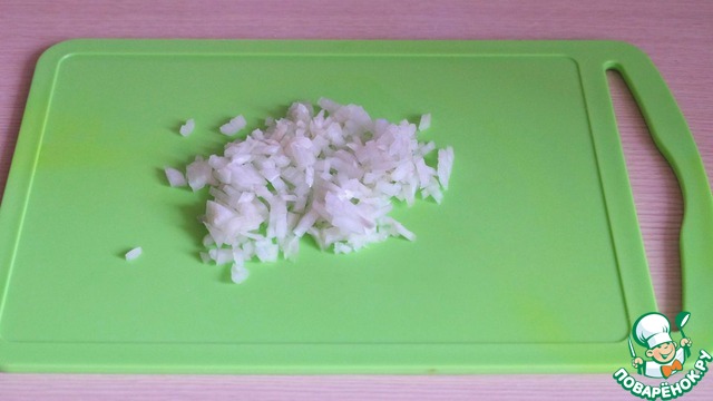 Нашинковать мелко лук, он будет необходим для приготовления начинки голубцов.