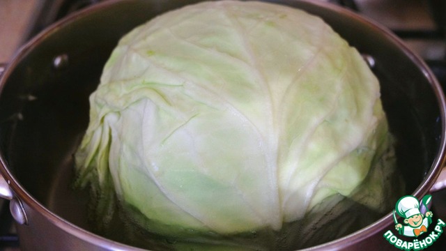 В кастрюлю добавить воды, соль, лавровый лист, перец горошком. Опустить кочан капусты, бланшировать (3-5 мин.)