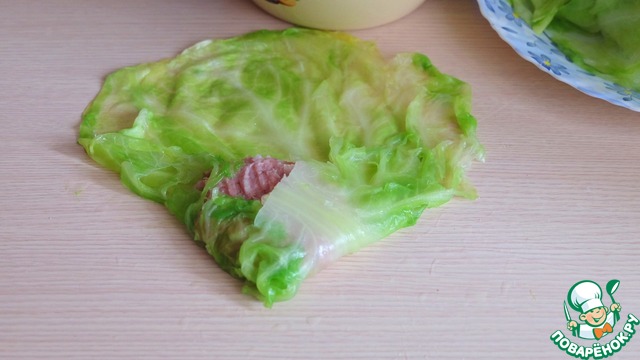 Аккуратно разобрать кочан на отдельные листочки. На середину выложить 1,5 ст. ложки готового фарша.