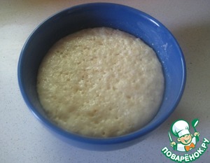 В теплое молоко добавить дрожжи, 1 ст. л. сахара и 1 ст. муки. Хорошо перемешать и поставить в теплое место на 15 мин. до появления "шапочки".