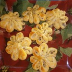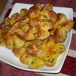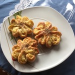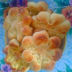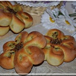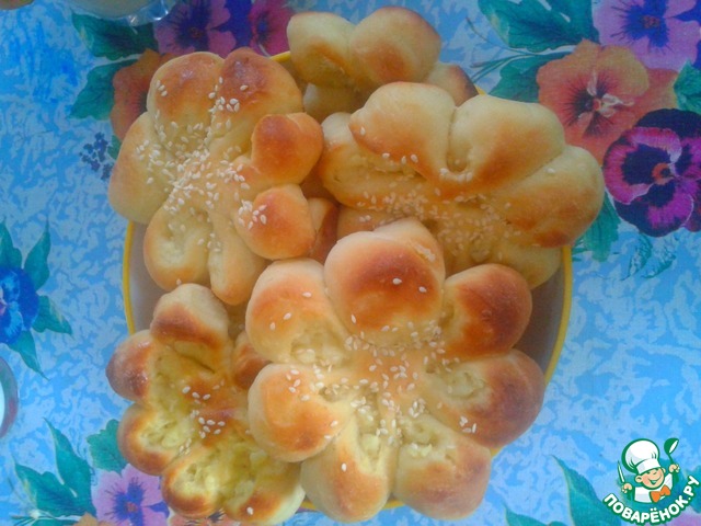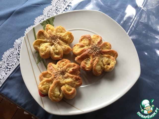 Смазываем сверху пирожки желтком, в центр цветочка насыпаем семена льна.