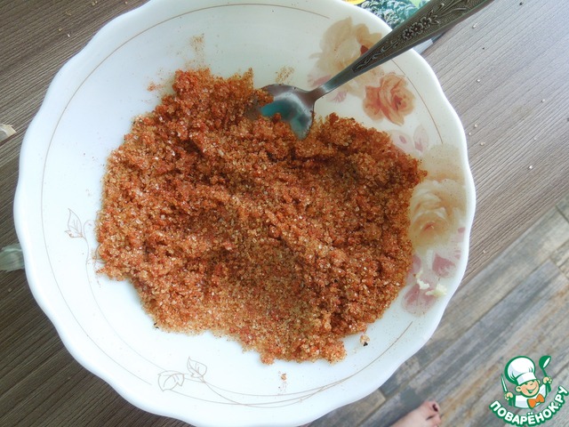 • В глубокой тарелке смешать все сыпучие ингредиенты, чеснок пропустить через пресс, хорошо перемешать, консистенция получится чуть влажная и рыхлая
