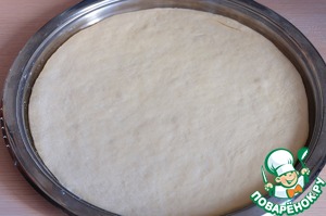 Готовое тесто раскатать в пласт, перенести при помощи скалки в форму для выпечки, предварительно смазанную растительным маслом.