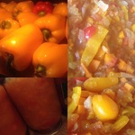 Чищенные перцы складываем в глубокую миску, т. к. они пустят сок, который мы добавим в подливу, не дадим добру пропадать.
