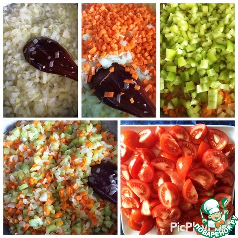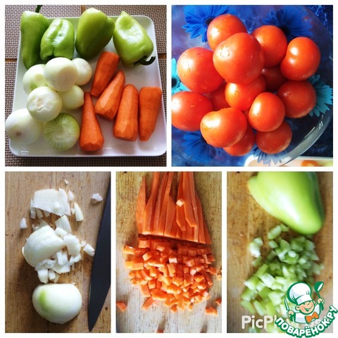 Пока выпекаются перцы, подготовим овощи для подливы. Моем и чистим лук, морковь, томаты и оставшиеся 4 болгарских перца, которые я также добавляю в подливу.