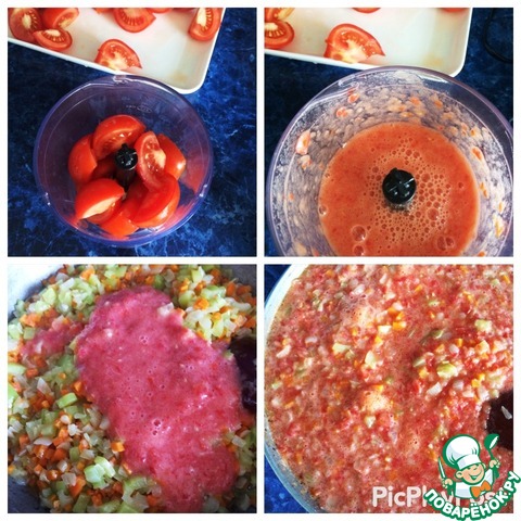 Измельчаем помидоры в блендере порциями и добавляем в сковороду.