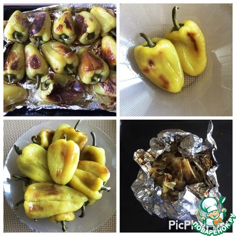 Готовые перцы вынимаем из духовки и даем какое-то время им остыть, чтобы можно было очистить от шкурки. Как вы понимаете, я все делаю параллельно, и перцы пеку, и подливой занимаюсь.