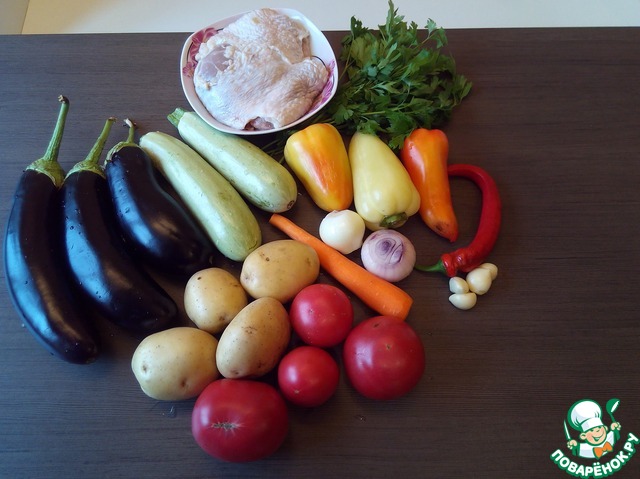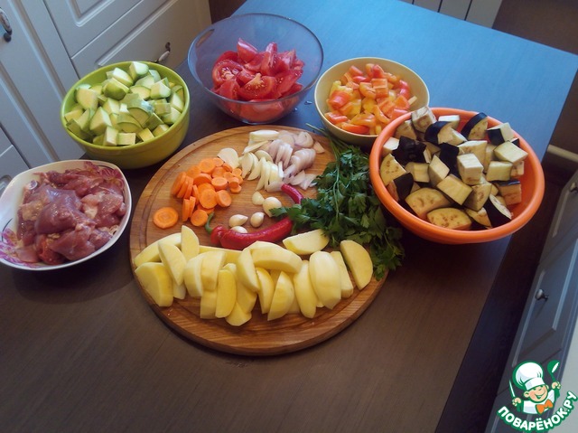 Мясо и овощи порезать крупными кубиками, лук полу кольцами. Обязательно посолить, затем отжать баклажан перед обжариванием, что бы убрать горечь.