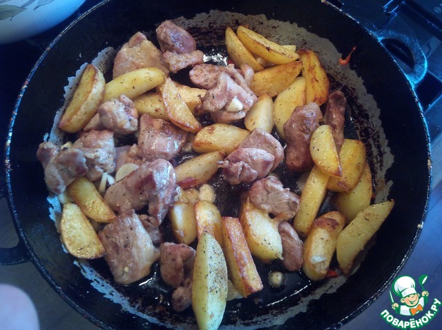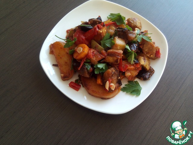 Самый последний жарим картофель, доводим до говности, добавляем любимые специи ( у меня прованские травы), чеснок и начинаем добавлять обжаренные до этого овощи. Мясо, баклажан, кабачек, болгарский перец, лук с морковью и помидор. Все вместе тушим буквально 2-3 минуты, добавляем петрушку.