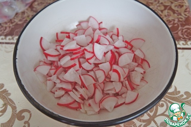 Редис нарезать тонкими ломтиками-четвертинками и выложить в глубокую миску. -