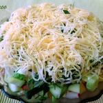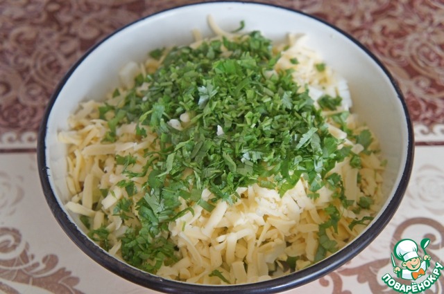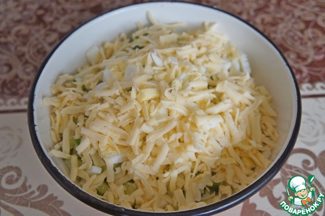 Затем нарезанный мелкими кубиками или натертый на крупной терке сыр.