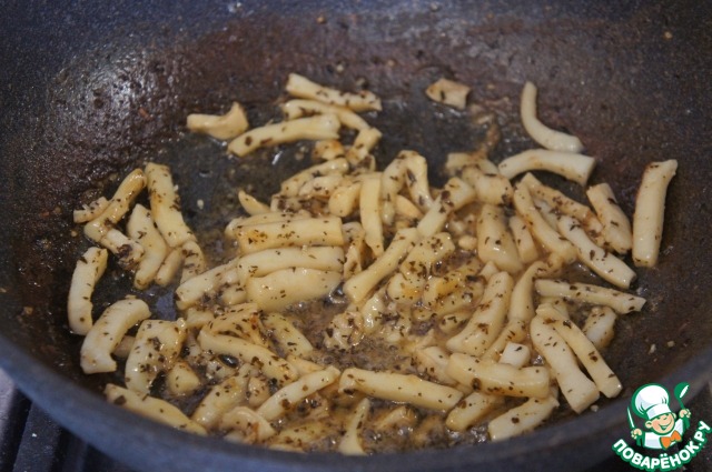 Говорю, кальмары не готовят долго, они резиновые становятся, но дочка сказала, что именно так было в рецепте, а кальмары и правда получились очень нежные.