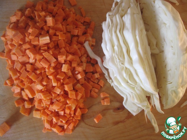 Для фарша морковь и капусту нарезаем мелкими кубиками.