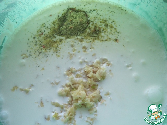 Для заливки сметану соединяем с водой, приправой и измельченным чесноком.