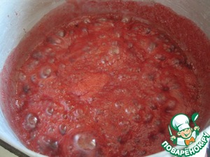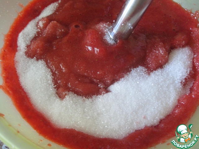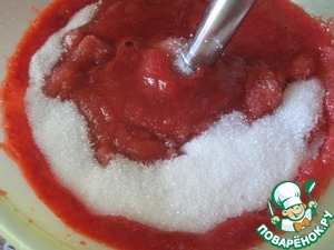Выжимаем пюре из клубники, соединяем с сахаром и увариваем до 120 * -