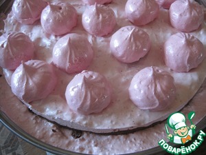 Готовим 2 часть мусса и заливаем в форму диаметром 32 см, закрывая зефир. На мусс кладем, освобождая от кольца диаметром 28 см. бисквит с муссом и зефиром.