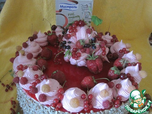 Очень ягодный, сладкий, огромный торт со вкусом и ароматом летних ягод. Изюминкой этого торта является то, что мусс приготовлен с добавлением мягкого и вкусного риса, который пропитывается ароматом свежей клубники и после застывания приобретает вкус сладких орехов или семечек и никто не может догадаться, что это рис.